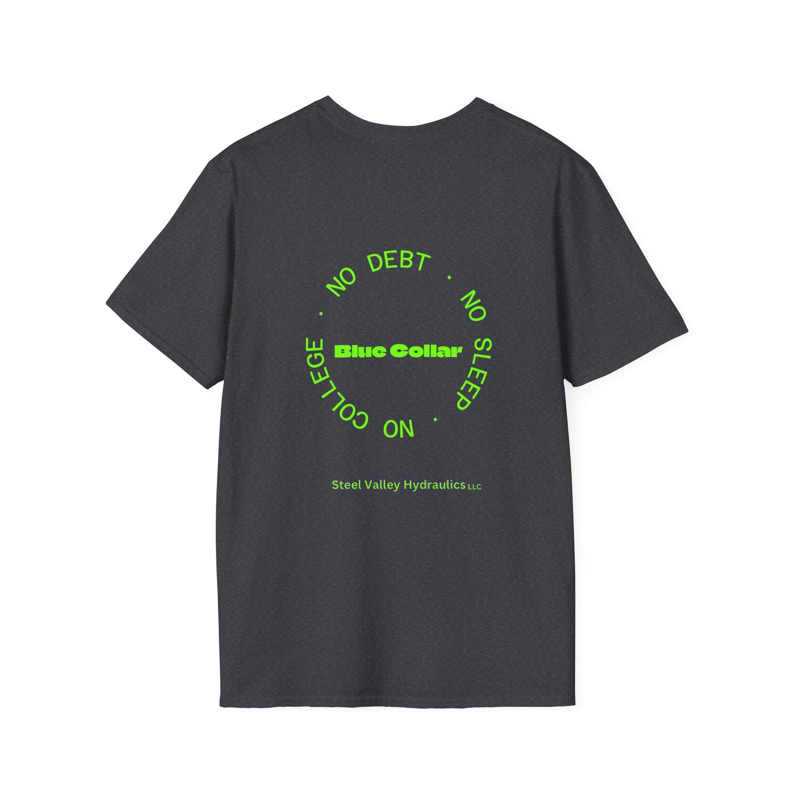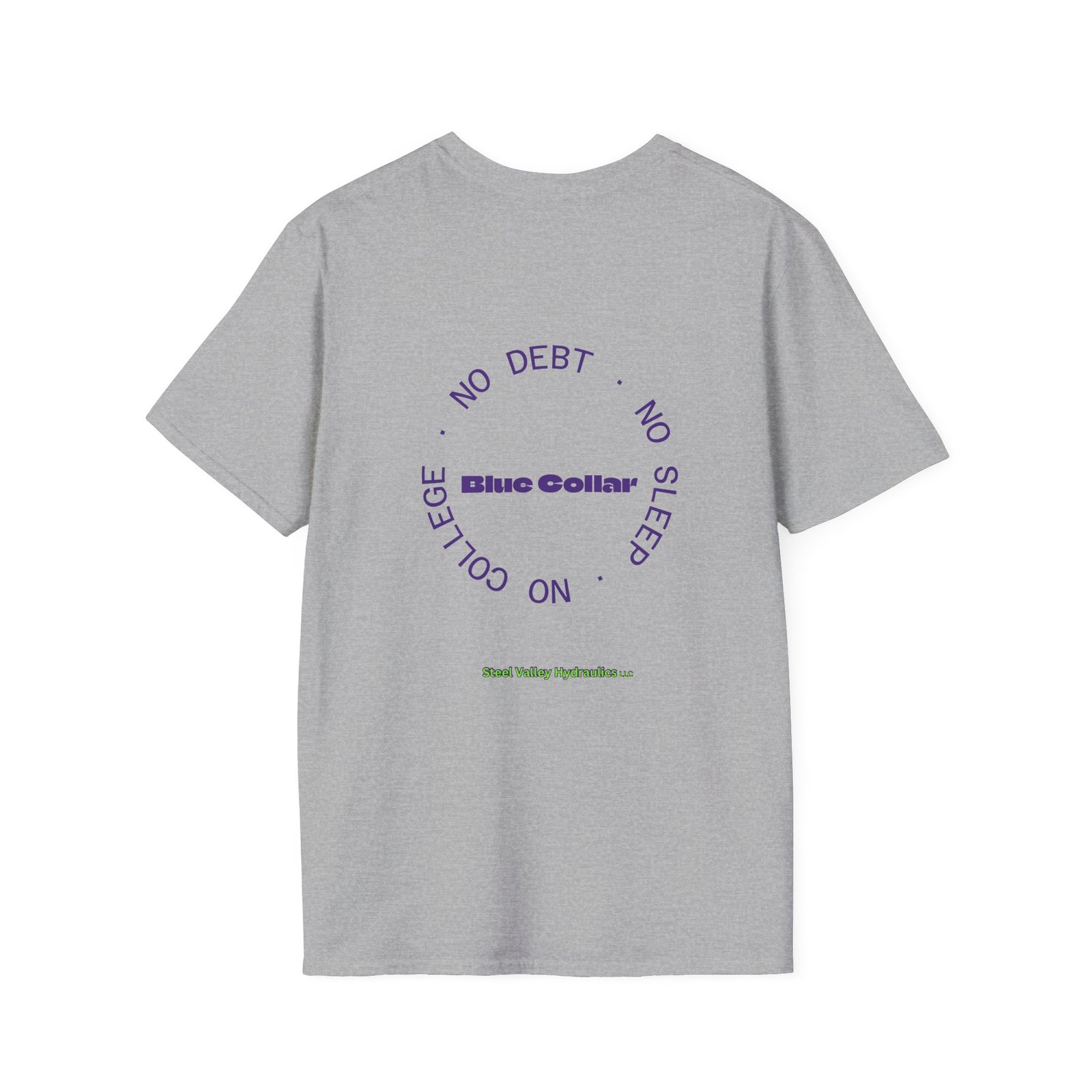 This Blue Collar T-Shirt with the ‘No college, No debt, No sleep’ quote from steel valley hydraulics exudes a casual and cool vibe, perfect for anyone looking for a relaxed and laid-back style. Ideal for young adults, college students, and anyone who values comfort and style. Suitable for casual outings, college parties, and everyday wear.